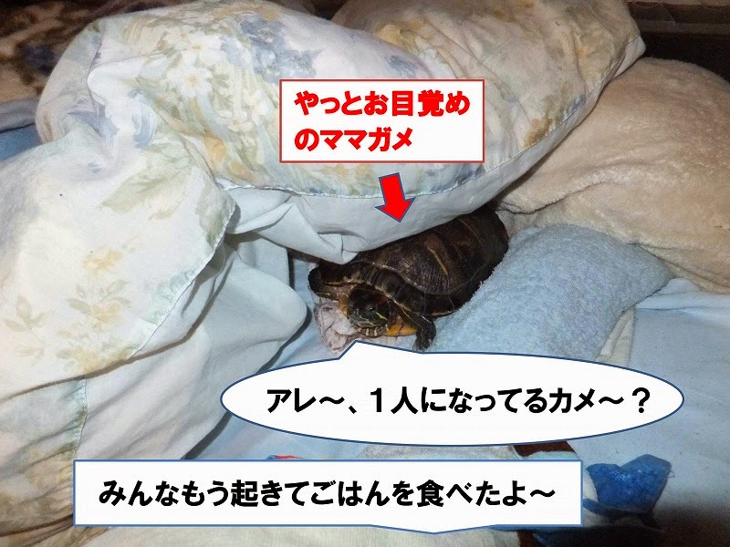 目覚めて一人ぼっちになってたママガメちゃん、きょとーんとしたお目目ですね(*^^*)
